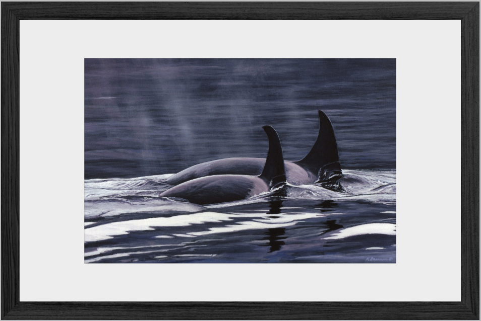 This fine art print captures a quiet, powerful moment as two orcas move just beneath the surface, their dorsal fins breaking the dark, reflective water. The subdued tones and realistic detail create a sense of depth, movement, and calm strength—an understated statement piece inspired by the wild Pacific.