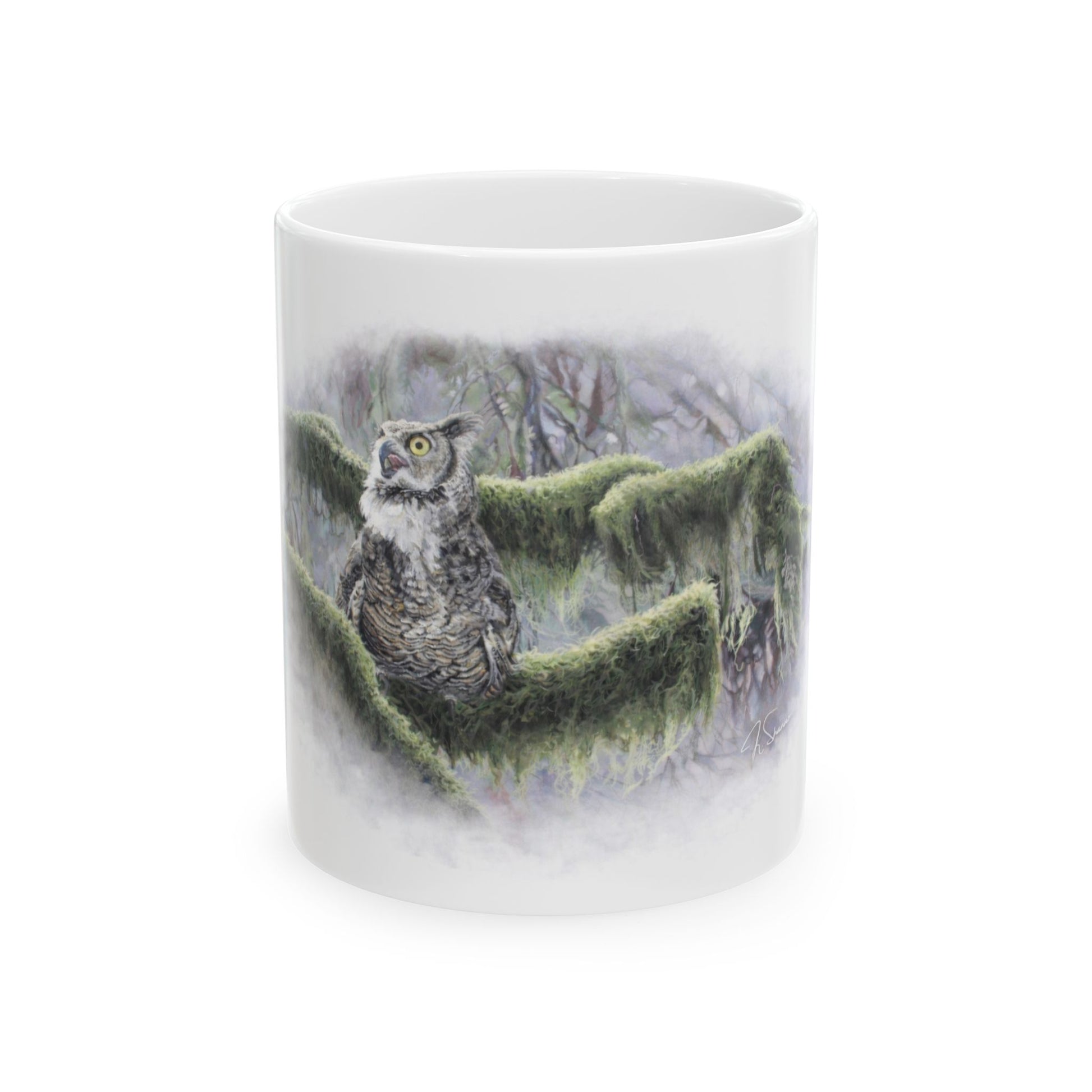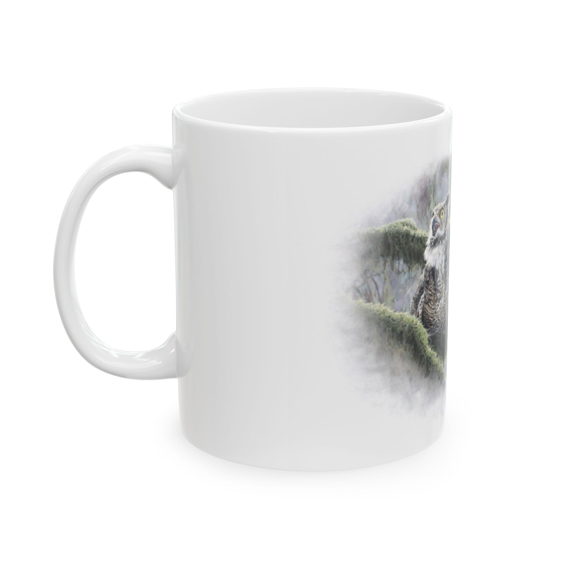 Steam rises from a morning cup as mist clings to moss-draped branches. This glossy ceramic mug carries a soft, watercolor-style scene of a great horned owl perched among rain-soaked limbs — quiet, watchful, and a little wild. Hold it when you want a slow start: the weight of the mug, the comfortable C-handle, and the muted forest tones pull your attention inward. It fits on a cluttered desk during late-night creative stretches, beside a well-loved novel at a windowsill, or tucked into a weekend ritual of tea and reflection. Durable white ceramic keeps the artwork vivid, and the glossy finish deepens the nocturnal greens and subtle grays so the scene feels almost alive every time you sip.